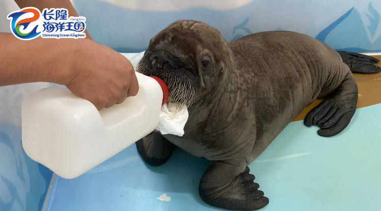 当然不会!喔喔被无数爱心托举着,奶爸们四处奔走、爱心接力,首先为喔喔借到了天敌——虎鲸的奶。原来,长隆专家团队在虎鲸生产后奶量充足的前提下,超低温冷冻贮存了虎鲸奶以备新生小虎鲸不时之需。尽管来自天敌,但虎鲸奶的脂肪含量与海象奶相近,成为喔喔理想的“口粮”。初期,奶爸天团每两个小时就要给喔喔喂奶一次,一天下来就是十二次!但四位奶爸不辞辛劳、轮流值守,悉心呵护。